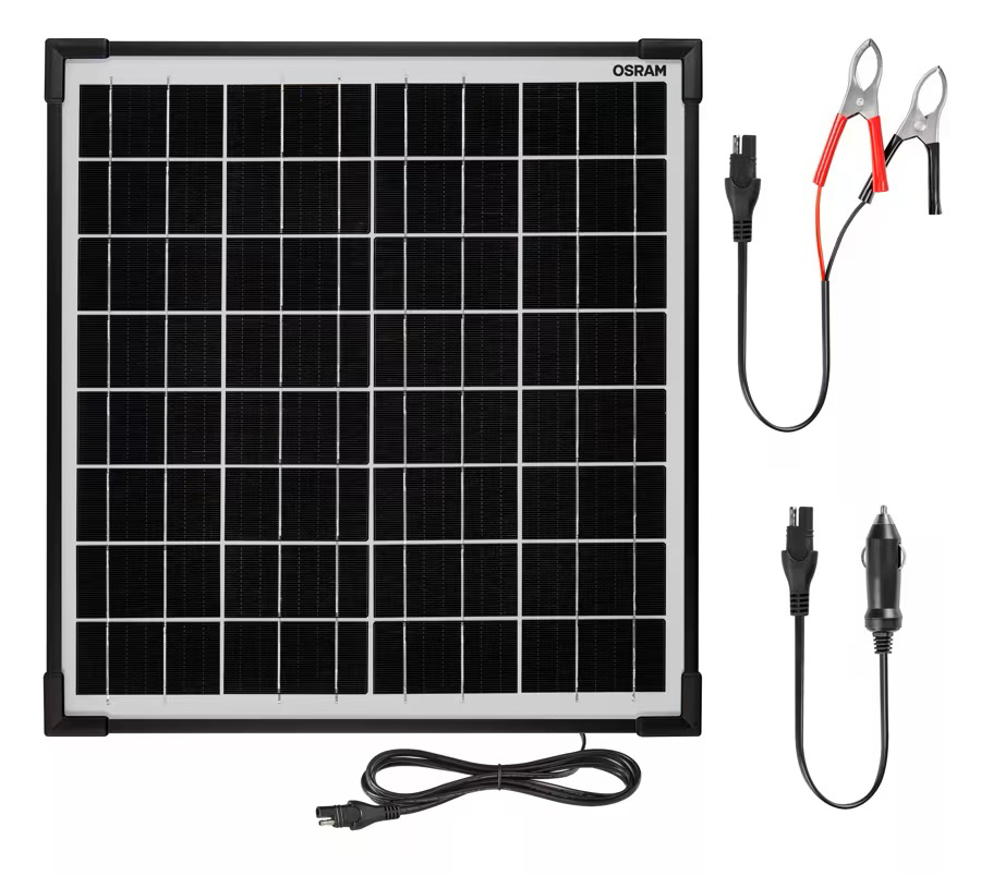 12V saules akumuliatoriaus palaikymo irenginys — monokristaline panele iki 20W, IP65 atsparumas, palaikymo srove iki 1.11 A. Puikiai tinka sezoniniam transportui (motociklams, klasikiniams automobiliams, kemperiams).